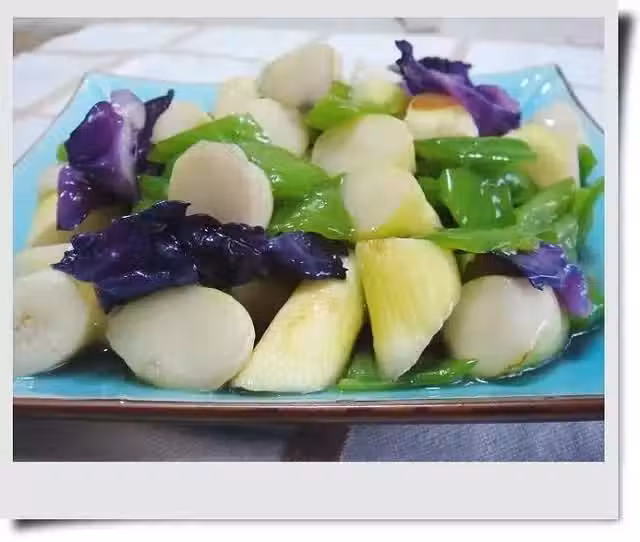 1、茭白切滾刀塊、紫椰菜、尖椒切段