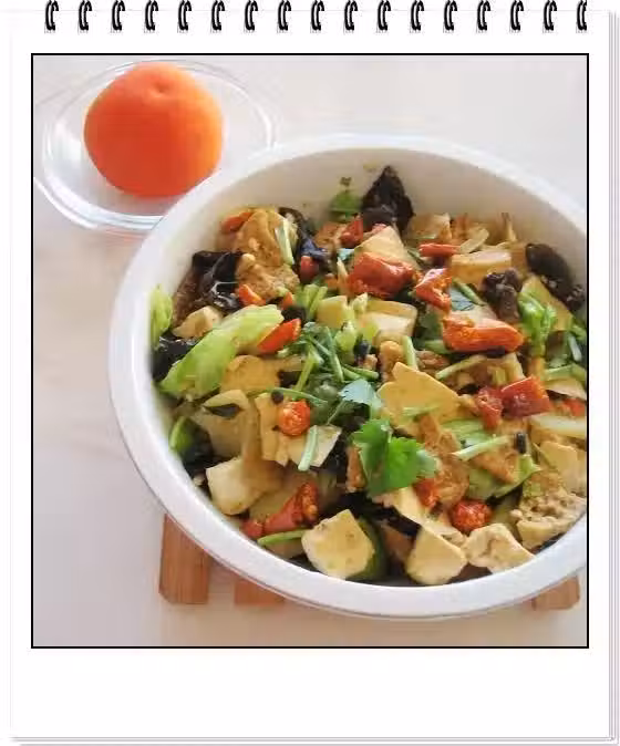 2、起鍋熱油,放入干辣椒、花椒與豆腐一起翻炒,