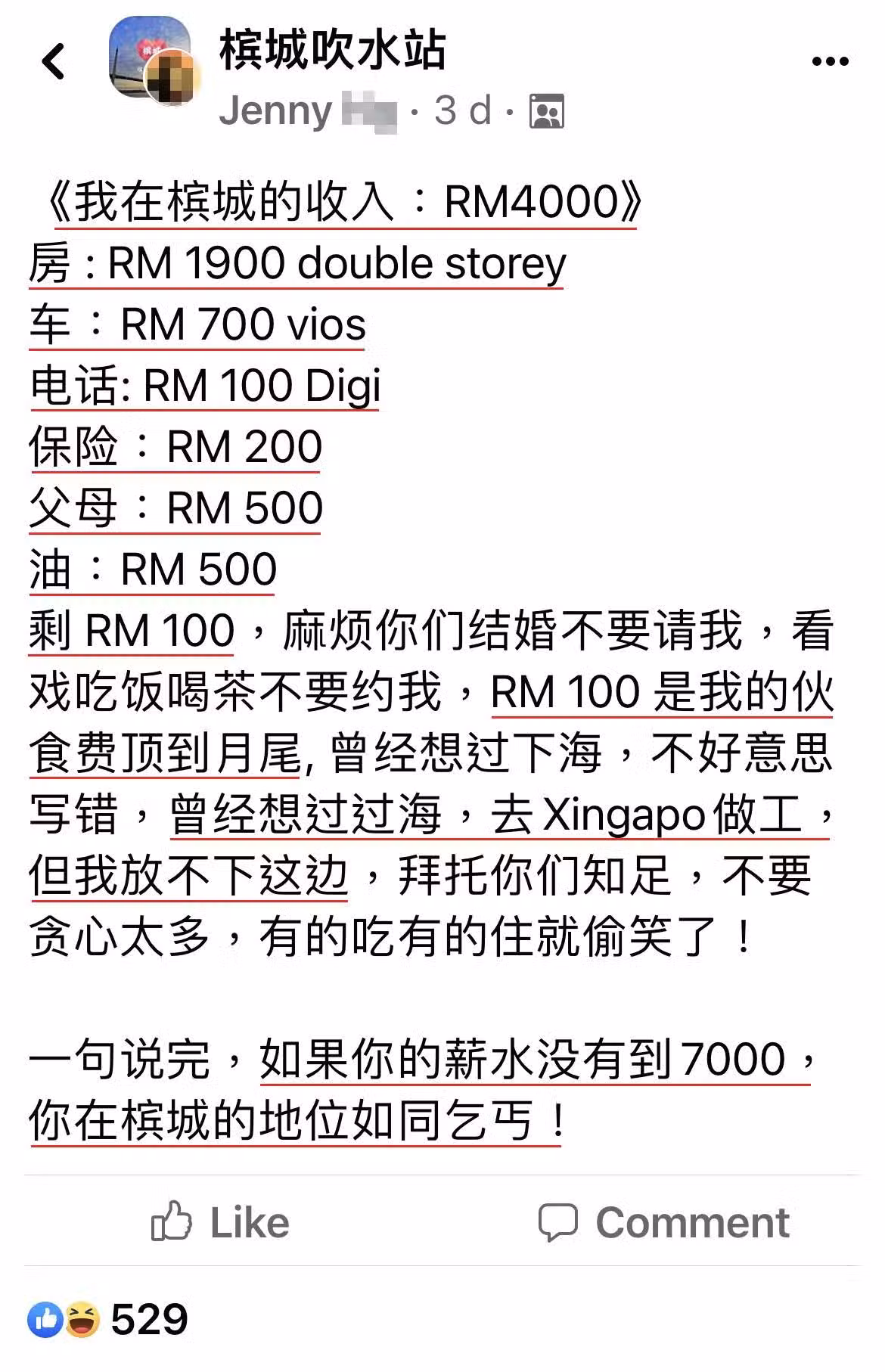 吉隆坡RM4000就夠,檳城網友卻抱怨沒有月入RM7000,活的像個乞丐,網友:是你自己作的吧