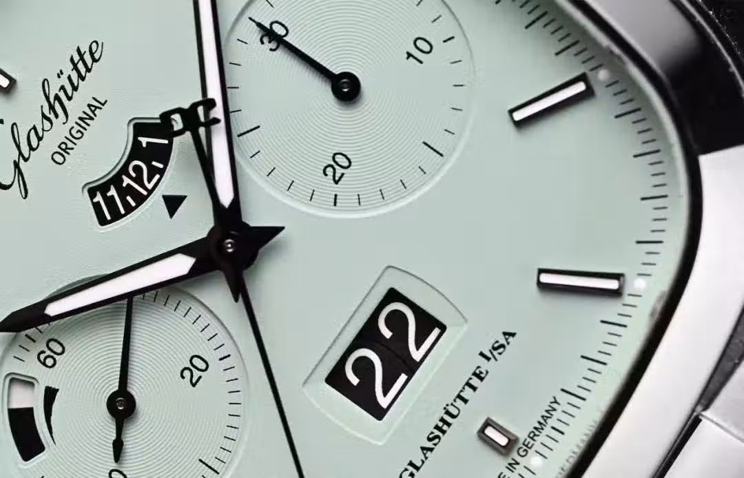 除此之外,當然也不能少了格拉蘇蒂原創標誌性的大日曆,日曆視窗顯示在6點鐘位置。與12小時計時窗口相互呼應,讓盤面看起來平衡和諧。