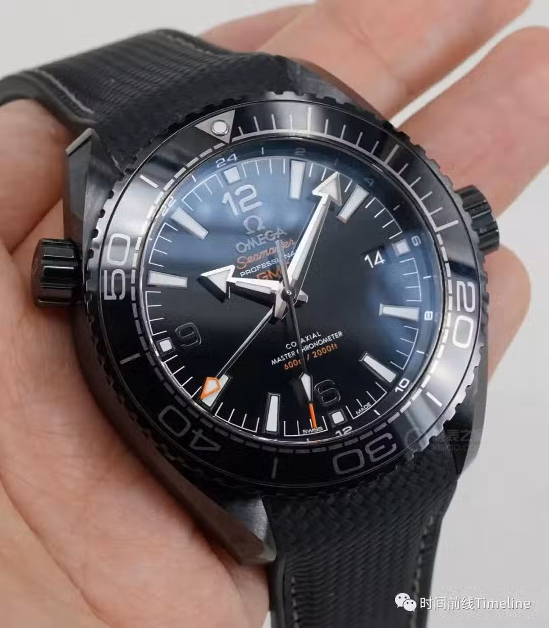 歐米茄深海之黑在專業潛水錶之外,也是一隻GMT兩地時表。盤面上有一根兩地時指針,兩地時指針末端,有橘黃色箭頭。