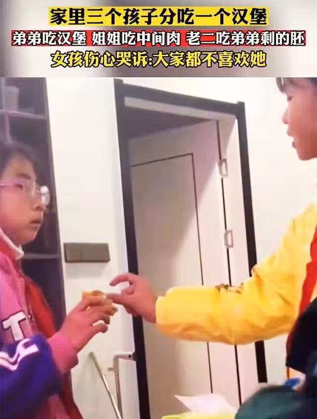 從視頻里看家庭所居住的條件,這個家庭應該不算是很窮的那種,至少不會窮到連三個漢堡都買不起,況且就算真的買不起也可以從中間將漢堡切成三份,而不至於做到如此明目張膽的偏愛。