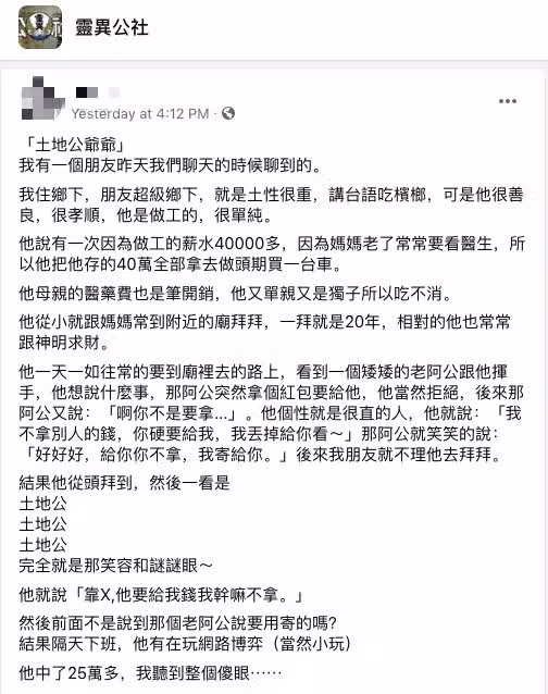 對此,網友們也看傻了,紛紛留言說「百善孝為先!該賞!」、「孝子果然有好報」、「孝順坦率單純的個性,才會讓土地公想幫他忙吧」、「看完起雞皮疙瘩」、「土地公也曾幫助我好多次」。不過也有人抱持質疑態度,說「土地公會給偏財嗎?」、「確定有拿到錢嗎?我朋友也是在玩那種,結果賺錢後卻拿不到,對方跑路了」。