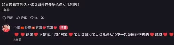 「不是我介紹的對象(指Chris),寶貝女婿和寶貝女兒是從 10歲一起讀國際學校的。」意味著,蔡天鳳與前夫鄺港智結婚前,已認識現任丈夫。
