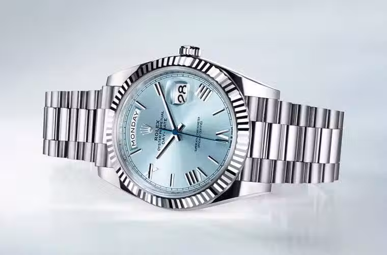 ▲Day-Date 2022年推出新款鉑金版228236,手錶採用少見的冰藍色面盤,錶圈也從拋光錶圈改為了三角坑紋錶圈。