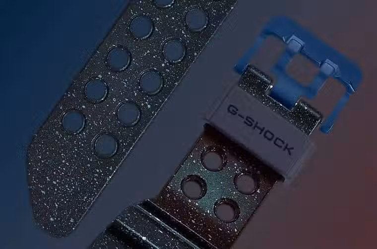 GWF-A1000APF-1A擁有五顏六色錶殼的關鍵在於製作過程中,品牌會將隨機圖案的彩色碳纖維和玻璃纖維材料堆疊壓製後再進行切割,如此一來就能塑造出如同箭毒蛙外表獨特的紅橙色、黑色與藍綠色交織身體紋路。至於手錶的樹脂錶帶則是用偏光墨水印刷技術,打造出近似青蛙皮膚斑點的圖案。就連底蓋刻印的蛙人系列招牌青蛙圖騰,G-SHOCK也特別添增亞馬遜箭毒蛙斑點與30週年字樣,使得這款外型搶眼的蛙人手錶更添紀念意義,除了出色外型,手錶本身就是個充滿話題的存在。