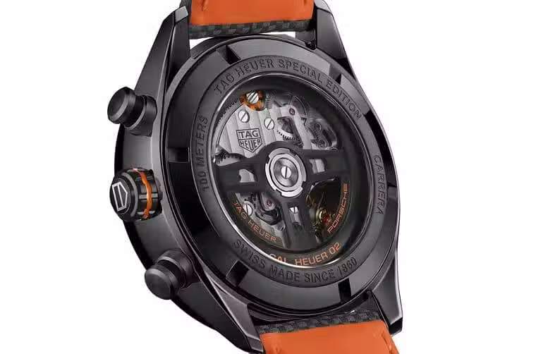 錶背採用透明底蓋大方露出手錶搭載的Heuer 02機芯,這枚機芯與Carrera系列計時碼錶宛如天生一對般讓人倍感熟悉,而且品牌也維持著保時捷聯名系列的特色,將機芯自動盤改造為狀似保時捷跑車方向盤的鍍黑鏤空造型,且自動盤上的TAG HEUER、PORSCHE以及機芯字樣也都塗上橘色呼應手錶整體設計,包括機芯內部的導柱輪零件也以橘色點綴,其與垂直離合機制共同負責操控計時功能,既能精準操作計時動作,也能避免計時功能剛啟動時,計時秒針可能產生的顫動情形,機芯的動力儲存達80小時,搭配手錶達到100米的防水性能,將賽車錶注重的運動機能與實用性推向高點,內外兼具的設計,強勢吸引賽車迷與錶迷的目光。