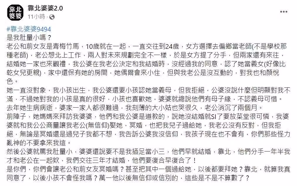 對婆家感到心寒,也讓原PO忍不住問,難道她拒絕就是度量小?若真的答應,以後小孩不會怪她嗎?大批網友都站在她這邊,力挺她說:「妳是對的!要堅持!」、「可以叫公公跟她冥婚啊…讓婆婆展現一下她的大肚量。」、
