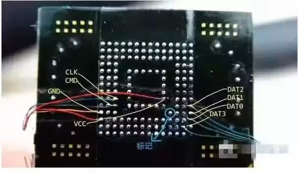 我們再來看看此款晶片的焊腳接線圖!eMMC晶片,簡單的說就是一個集成了控制器的閃存晶片,再簡單點說,可以通過讀卡器,類似內存卡一樣去使用它,這時候需要把晶片上對應的引腳接到讀卡器上。