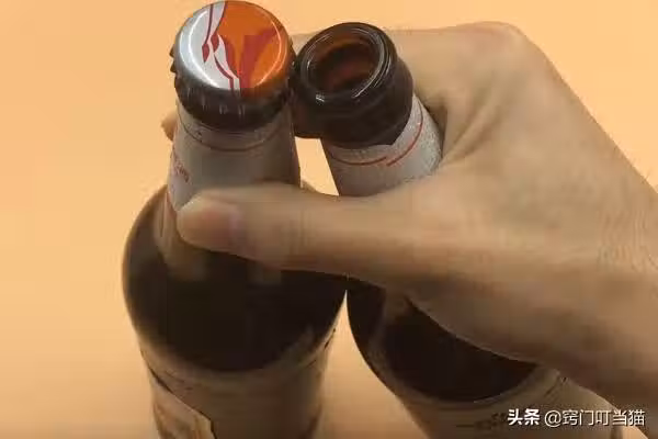 首先我們準備兩瓶啤酒,將其中一瓶啤酒的瓶蓋卡在另一瓶啤酒的瓶蓋上面,如下圖所示這樣,只需要單手握住兩瓶啤酒的瓶口部分,然後稍用力的往桌上一磕,上面的這瓶啤酒的瓶蓋就很輕鬆的打開了,是不是很實用呢?別再用牙齒咬了,學會這個妙招3秒就能打開。