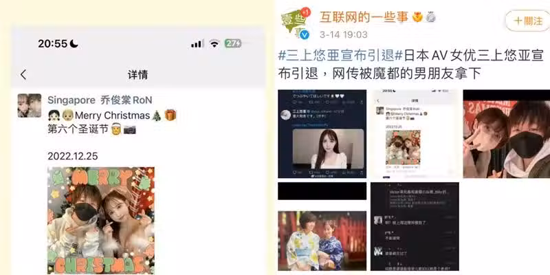 ▲微博上流傳「日本三上悠亞宣布引退,網傳被魔都(上海)的男朋友拿下」,疑似是上海小開,引發中國網友熱議。(圖/翻攝自微博)