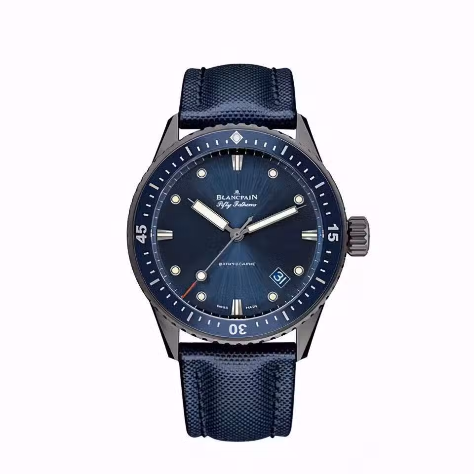 ●這款五十噚藍色錶帶配藍盤的設計,雖為運動表,但整體透漏出一份優雅運動的感覺。錶殼由灰色等離子體陶瓷製成,配備單向旋轉功能,表圈上嵌有藍色陶瓷內圈,表面飾有Liquidmetal液態金屬小時刻度,可有效防止變形。