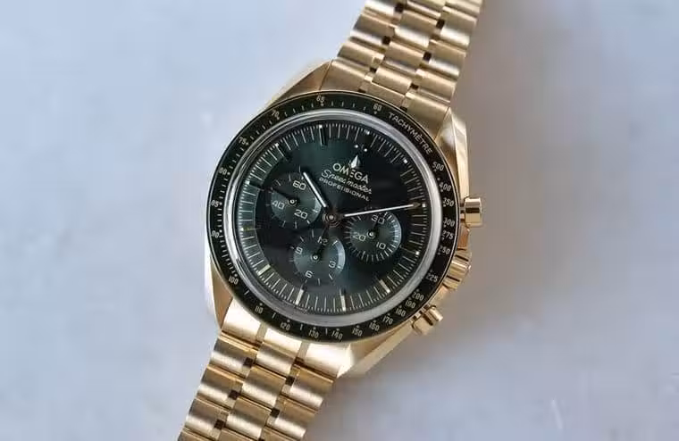 OMEGA歐米茄超霸系列著名款式Moonwatch登月錶2021年甫換上品牌前幾年打造的3861機芯完成世代交替,透過新機芯與手錶外部的新細節,讓登月錶這個一代經典深度進化成更符合現代所需的產品。該年歐米茄一口氣推出了不鏽鋼、Sedna™金和Canopus Gold™金等3種材質款式,且不同錶殼間又還有錶帶以及鏡面材質的個別差異,從而衍生出豐富的家族成員。本以為歐米茄同步發表這麼多款登月錶,應該足以讓市場陷入選擇困難癥(咦)好一陣子了,沒想到品牌2022年依舊保持滿滿的創作能量,進一步開發出採用Moonshine™金材質的最新登月錶,瞬間讓登月錶家族變得超級熱鬧,跳脫過往是以不鏽鋼為主的刻板印象。新款Moonshine™金登月錶分別有黃金面與綠面兩種版本,其中後者搭上近年的熱門色主題,且黃金色的錶殼搭配綠面又隱隱讓人想起錶壇中另一款強勢錶款,也難怪這只新的登月錶先前一發表就廣受關注,成為2022年眾多金錶新品中最耀眼的明星之一。