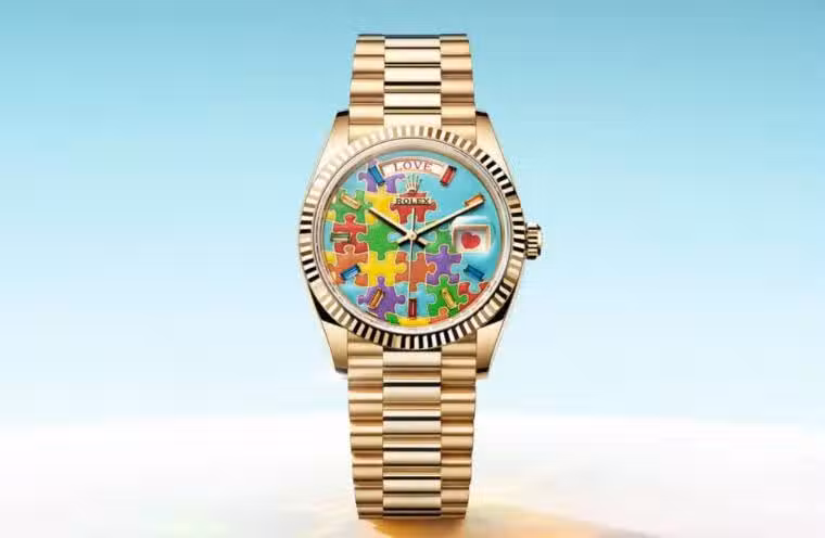 不讓Oyster Perpetual專美於前,Day-Date 36 2023年也出現以各種貴金屬錶殼搭配繽紛彩色琺瑯面盤的新作,琺瑯面不僅色彩繽紛,更從拼圖獲得靈感,同時面盤上共有十個方位的時標是用六種不同色調的藍寶石鑲飾而成,值得一提的是,12點鐘位置的視窗會呈現英文主題詞彙,3點鐘位置的視窗則會顯示專屬表情符號,替手錶帶來一股俏皮的氛圍。