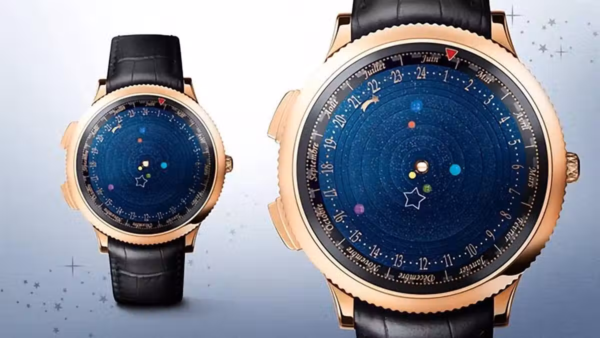 表盤再現了太陽的微縮模型以及從地球上肉眼可見的五顆行星:水星 - 金星 - 火星 - 木星 - 土星。每個行星都根據其現實生活中的自轉時間在自己的圓盤上移動。土星需要超過 29 年才能完成表盤的完整運行,而木星將需要近 12 年,火星需要 687 天,地球需要 365 天,金星需要 224 天,水星需要88天。