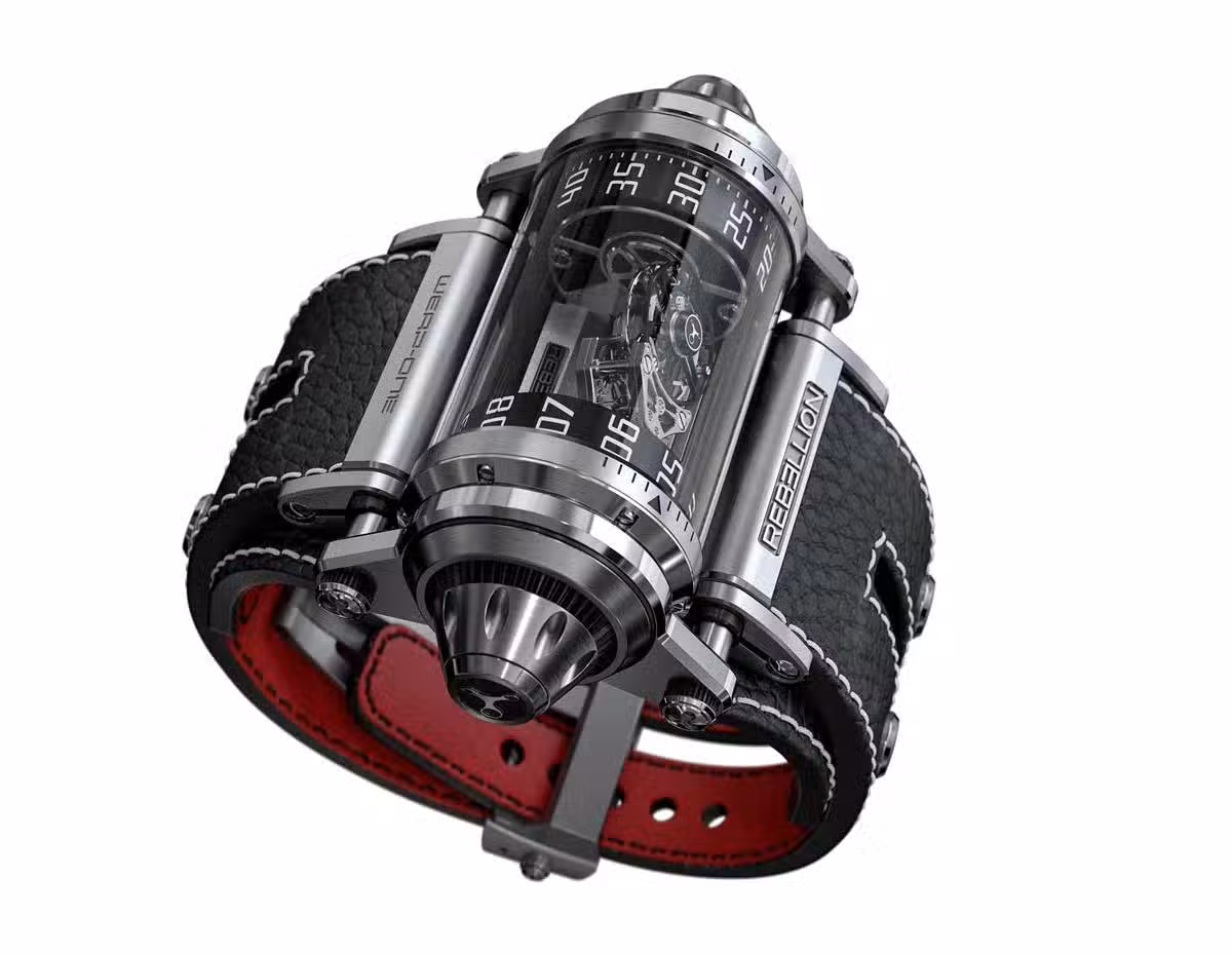 WEAP-ONE鉆石不對稱飛行陀飛輪憑借其結合鈦和藍寶石的纖細結構,與眾不同。兩個輪螺母錶冠封閉其非典型的圓柱形表殼。原始模型上的鈦金屬,在這里由藍寶石水晶加工而成。右邊的那個可以讓機芯上弦;左邊的那個可以設置時間。小時和分鐘顯示使用兩個同樣由藍寶石水晶加工並位於表殼兩端的滾輪。在時間信息之間,一個旋轉速度為60秒的非對稱飛行陀飛輪在數個軸上演化。