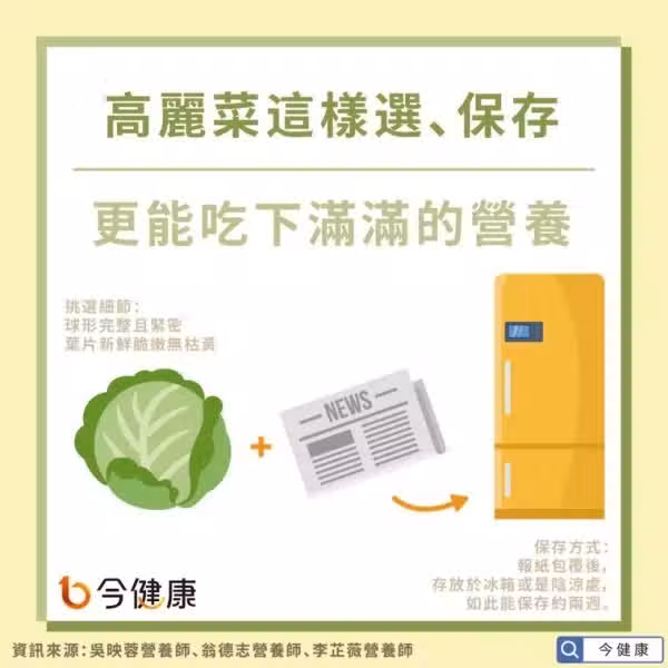 在挑選方面,營養師建議可以挑選球形完整且緊密的高麗菜,且葉片是新鮮脆嫩、沒有枯黃的為佳。而保存方面,則可以用報紙包覆後存放於冰箱或是陰涼處即可,如此就能保存到約兩週的時間。