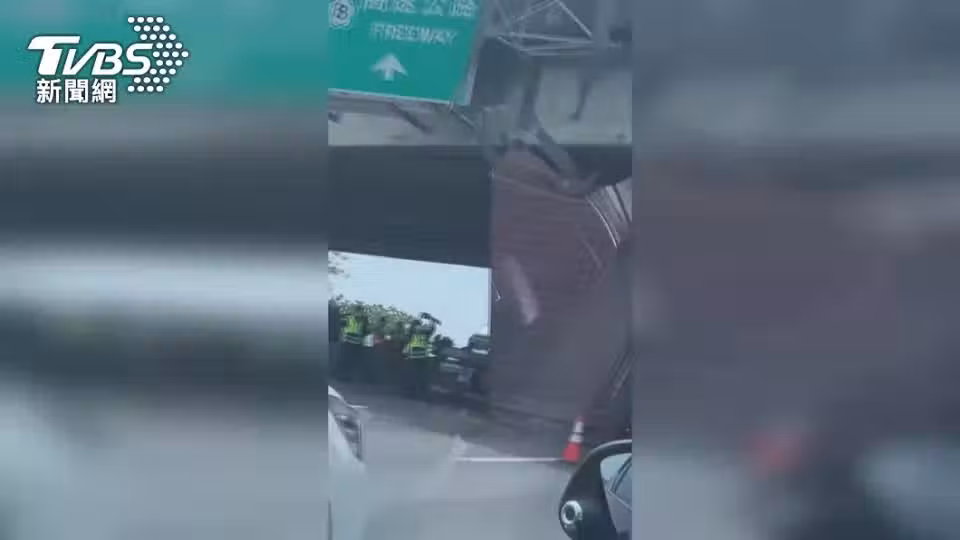 扯!20呎貨櫃突彈起「直立」卡橋墩害 國道塞爆