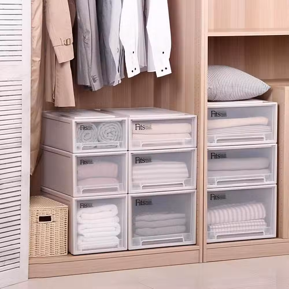 衣櫃內掛衣區底部的空間一般都是閑置浪費的,直接在此疊放衣服,又會顯得十分凌亂。可以使用抽屜式收納盒,多個疊放,正好可以把掛衣區底部的空間,全都利用起來。抽屜式收納箱可以把衣服分類收納,貼上標簽後更是一目了然,拿取方便,是日本無數家居達人推薦的衣櫃神器。