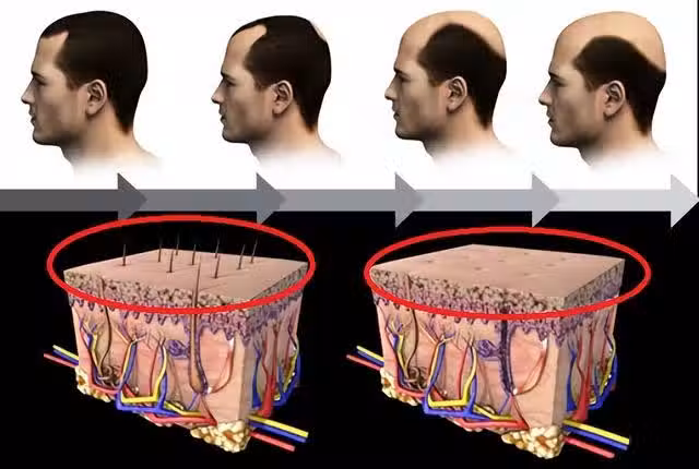 這種脫髮是「基因缺陷+雙氫睪酮(一種雄激素)」綜合作用引起的,雙氫睪酮會導致毛囊逐漸萎縮,慢慢地徹底不產生頭髮,所以這種脫髮有一個逐漸發展的過程,大致如下圖所示。