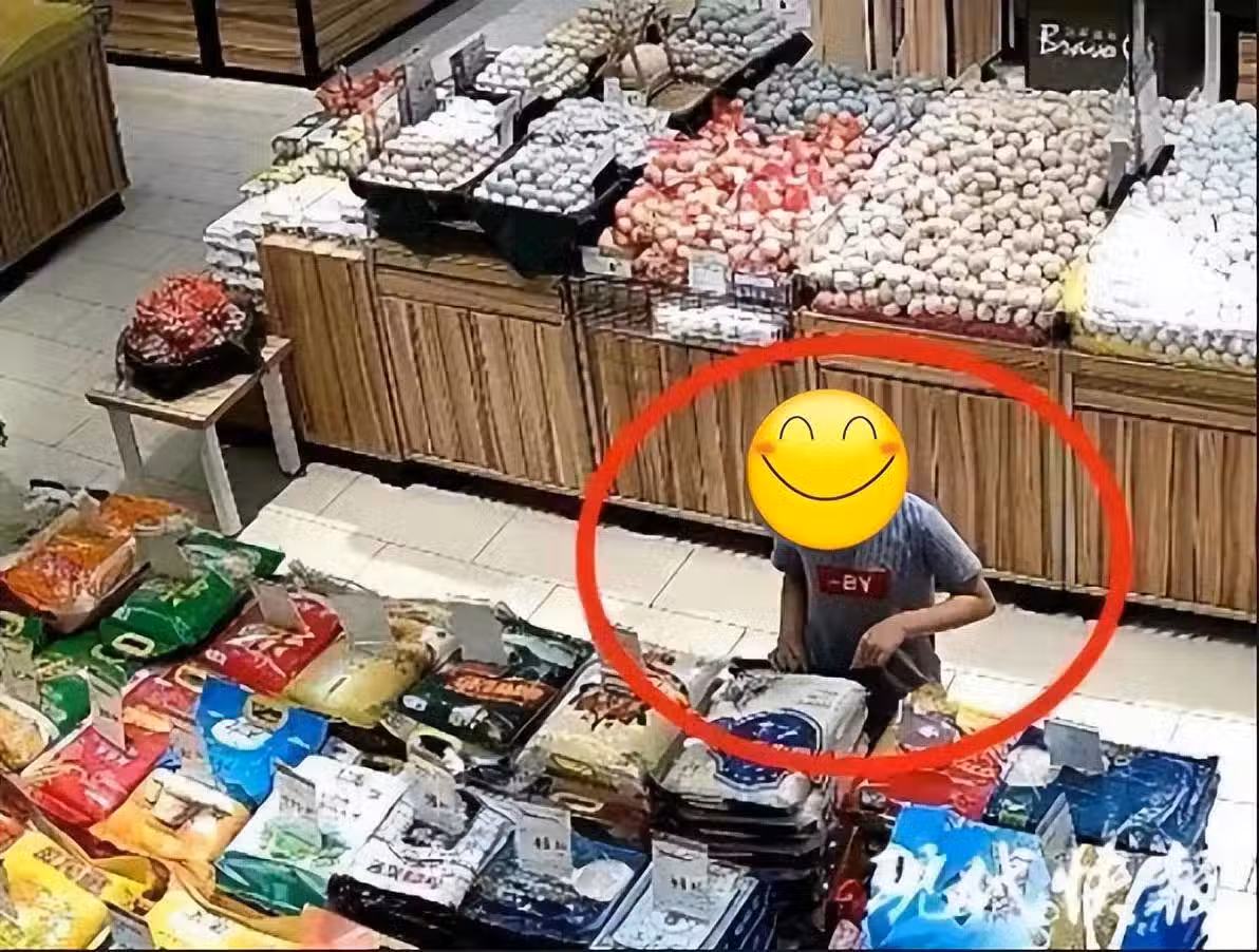 又比如這個小男孩,一個心血來潮,就用手指將貨架上的水蜜桃,每一個都戳了一個洞,這回家後,可能要連續吃水蜜桃了。
