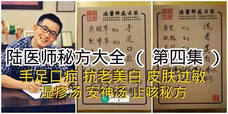 陸醫師秘方大全 (第四集)內有手足口症,抗老美白,皮膚過敏,濕疹湯,安神湯和止咳秘方。