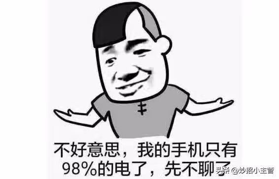 昨晚跟同學群聊天時候,中途有同學有事要先撤場,就發了一個搞笑表情:不好意思,我的手機只有98%的電了,先不聊了。另外一個朋友也順著他意思加了一句:你別管我們了,趕緊去充電,一定要充到100%,再找我們。引起大家哈哈大笑……