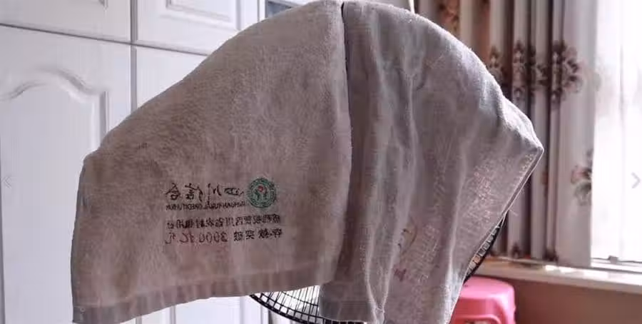 五分鐘後,我們可以開動電風扇,但這之前要在網罩上搭兩張毛巾,避免髒水飛濺。電風扇開最大檔,讓它轉2分鐘。