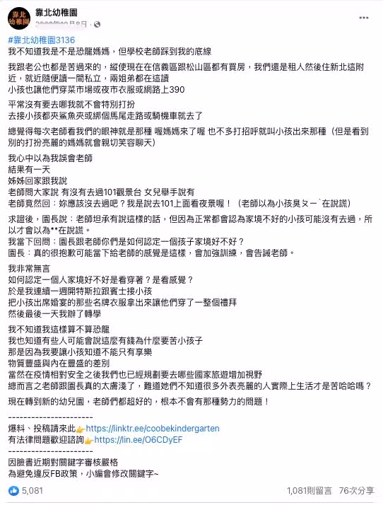PO文曝光後立刻引來數千名家長盛讚:「老師視野太低了,很多有錢人不開賓士」、「這種有特異差別眼光的老師才該檢討,就算真的家境清寒,也不應該對孩子的受教權有差別待遇」、「有這種老師,教出來的也絕對不會是尊敬她這個老師的學生!」除此之外還釣出育有三子女的男星黃鐙輝妻子其萁回應:「瓜張了,我家肯定也被這老師看不起,我家都買100元衣服。」