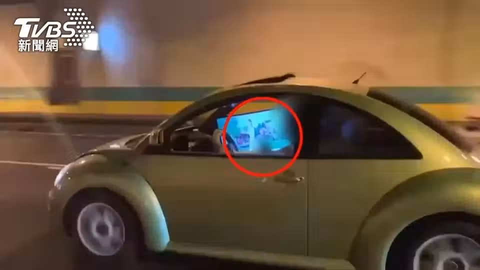國道3號木柵隧道,隔壁這輛蘋果綠的金龜車很吸睛,讓人忍不住多看幾眼的不是外觀,而是內裝有一台曲面螢幕,大到幾乎佔滿副駕駛座,連右側後視鏡都被擋住大半,以市售尺寸評估至少24吋以上,而駕駛邊開車螢幕還邊播影片,相當愜意,但這樣的行為屬於危險駕駛,違反道交條例最重罰2萬4千元。
