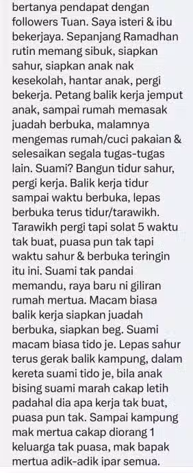 電視台主持人兼電台DJ阿末法德里(Fedtri Yahya)在推特帖文,公開一名女子的求助信息,對方申訴自己是名職業婦女,也是一名妻子和母親,整個開齋月都非常忙碌。