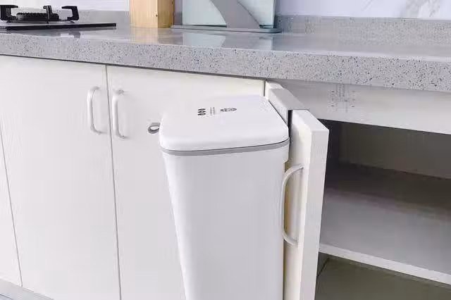 櫥櫃門除了內側可以利用,外側也是可以用的,我們廚房免不得了要有垃圾桶,一般都是放在水槽的旁邊,做菜洗菜切菜的時候,還是會產生廚余垃圾,還是需要來回跑,不停地彎腰很累人的。