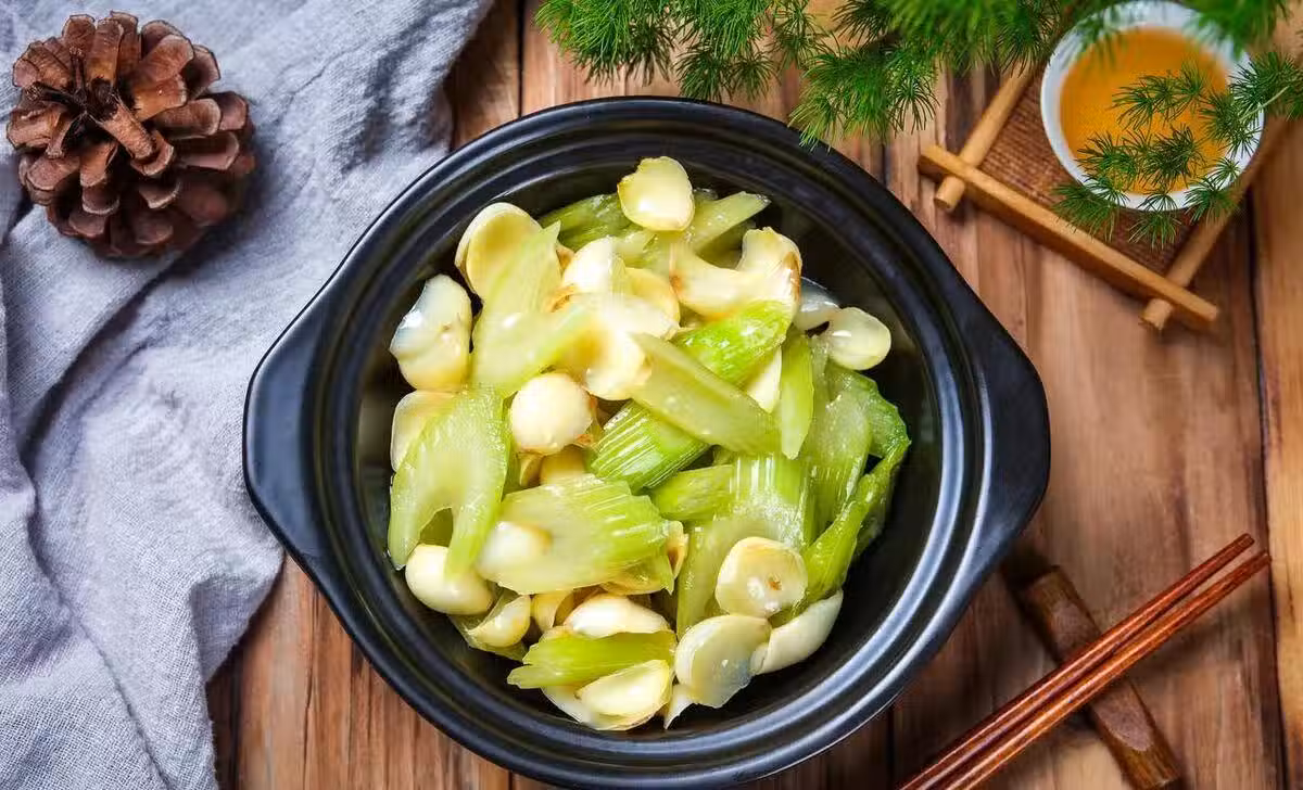 所需食材:西芹、百合干、蒜、鹽、雞精、料酒、生抽、食用油
