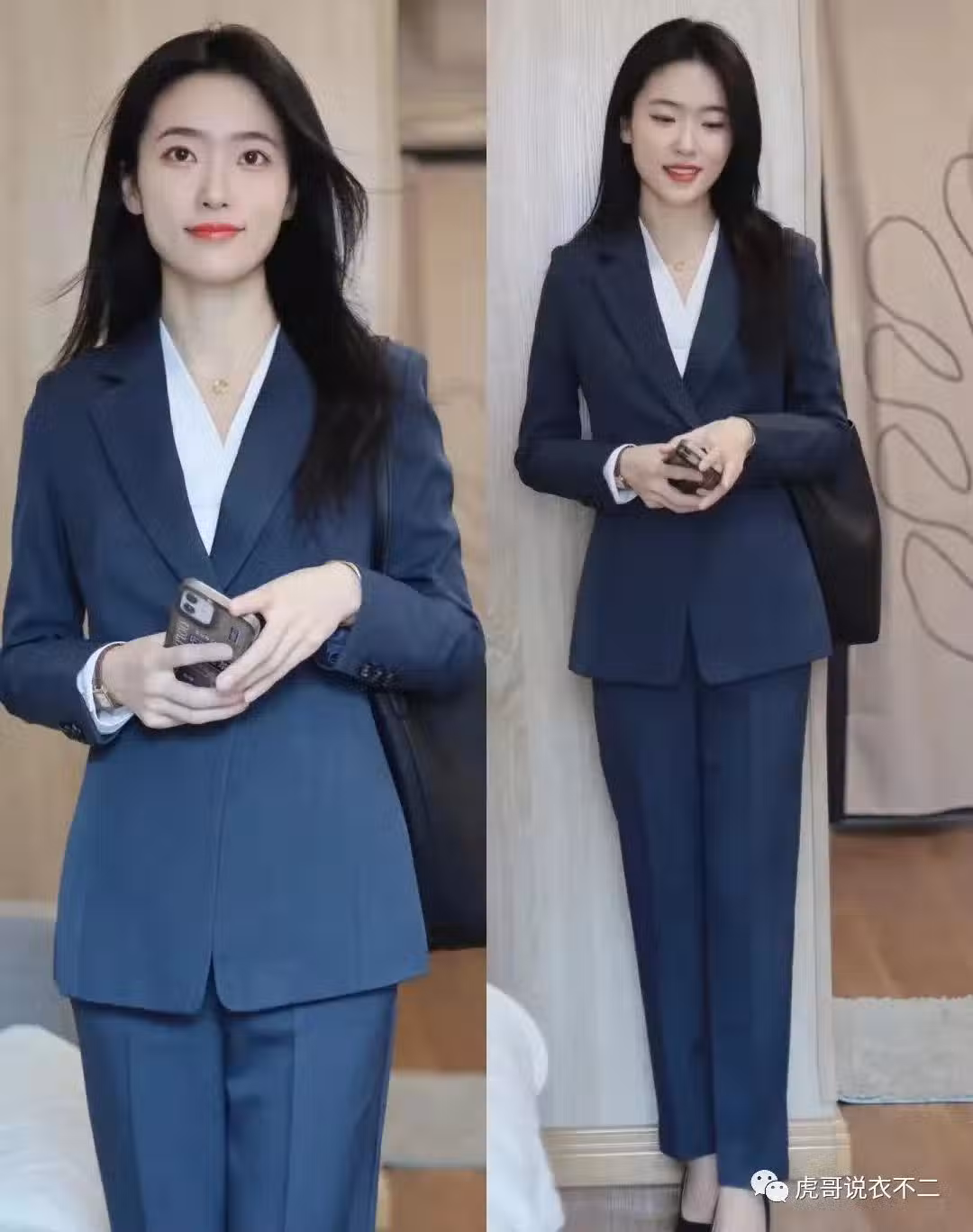 像圖中這套深藍色的西服套裝,其中運用的就是線條感顯著的西褲,展現出了比較筆直立體的輪廓感,可以輕鬆的將不完美的身材進行修飾。