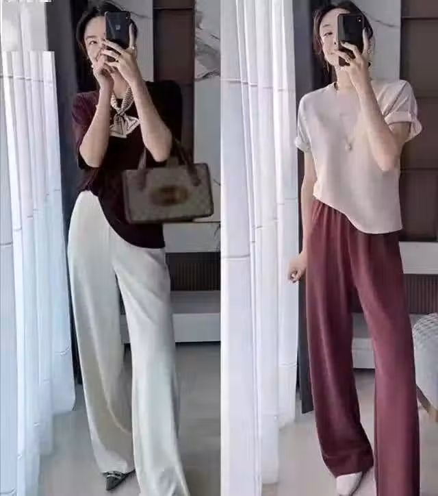 深紫紅色的T恤搭配奶白色的拖地闊腿褲,都是柔軟舒適的材質,在夏日穿讓人覺得舒適清爽,一點也不會覺得悶熱,T恤的下擺隨意塞進褲子裡,顯得腿型超長。而茱萸粉的棉T恤搭配紫紅色的拖地闊腿褲,不僅顯膚色還有溫柔優雅的女人味,很適合四五十的女人,但是對於身材矮小的個子,不建議選擇拖地褲,會壓身高更顯矮小,可以選擇九分的褲型,時髦顯高有耐看。