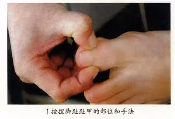 在腳上,按捏的部位是腳趾指甲生長邊緣的角部,按捏大拇趾(相當於手的大拇指),第二趾(相當於手的食指),