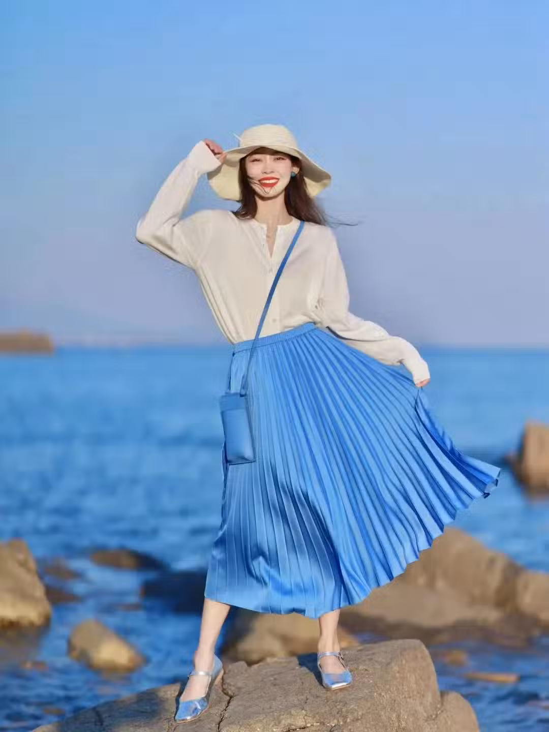 搭配一件克萊因藍的T恤和同色系的拖地長褲,整身穿搭就會顯得非常有層次感。