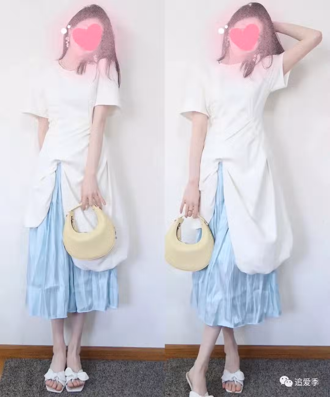夏天要穿得清爽一些,白T恤最實用,搭配顏色清淺一些的百褶裙,比如低飽和度的莫蘭迪色系,或者灰色,淺藍色的百褶裙,和白T恤搭配在一起,感覺更乾淨清新。