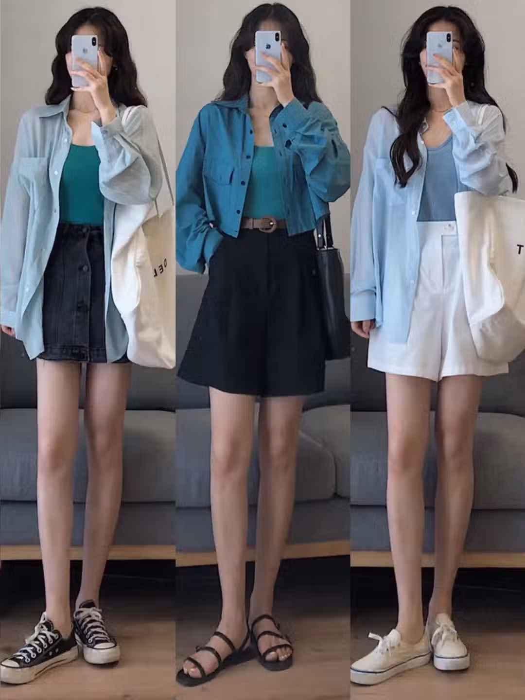 弔帶外搭輕薄款襯衫,輕熟隨性,要想穿出博主身上這種效果,推薦選擇偏緊身的修身弔帶。