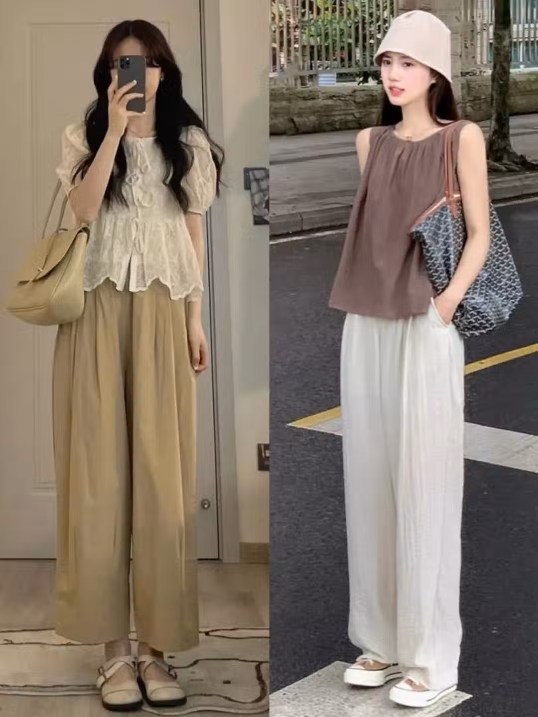 雪紡長褲,這類長褲既有垂感又輕薄透氣,即使單品上身,也不會悶熱。