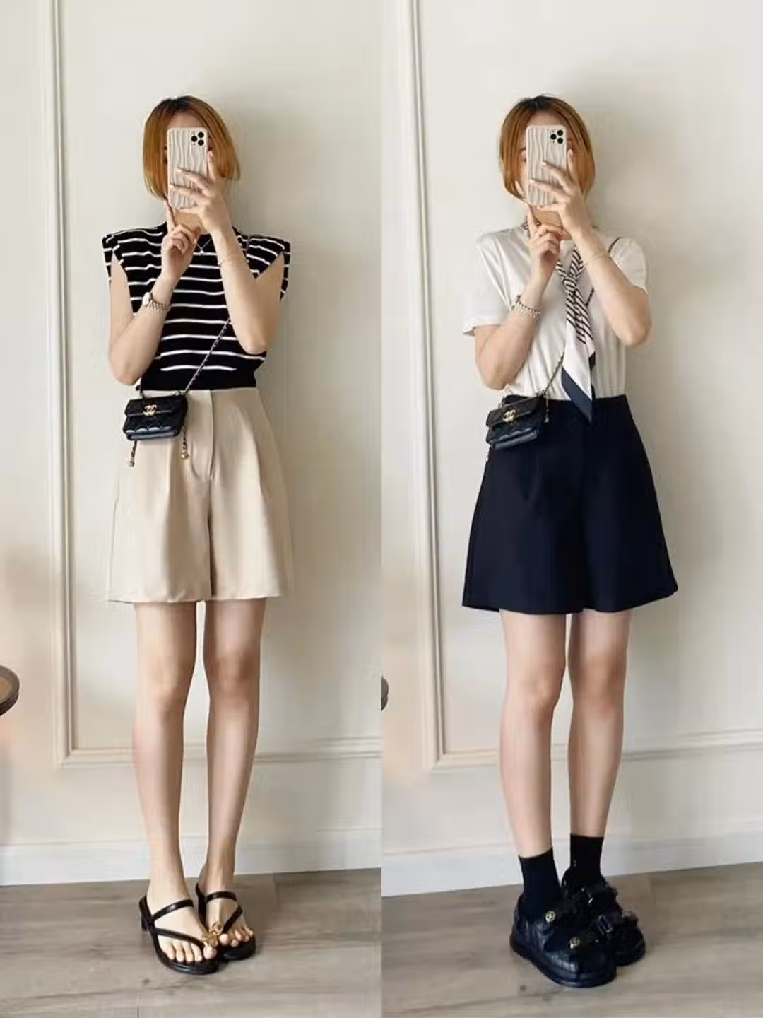 如果你是梨形身材,推薦選擇右邊這套上淺下深配色的造型;