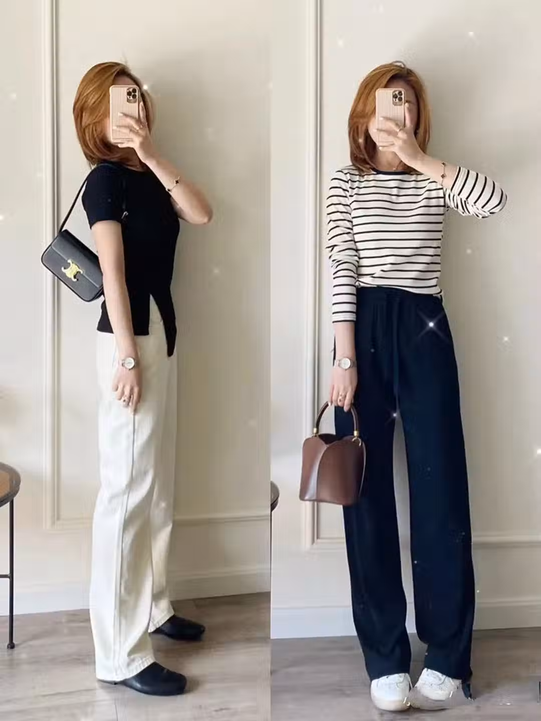 在長褲的選擇上,大家可以根據材質選配色,如果是西裝褲,黑白灰可以全都安排上,如果是牛仔褲,黑白色穿上身最符合中年女性的社會地位。