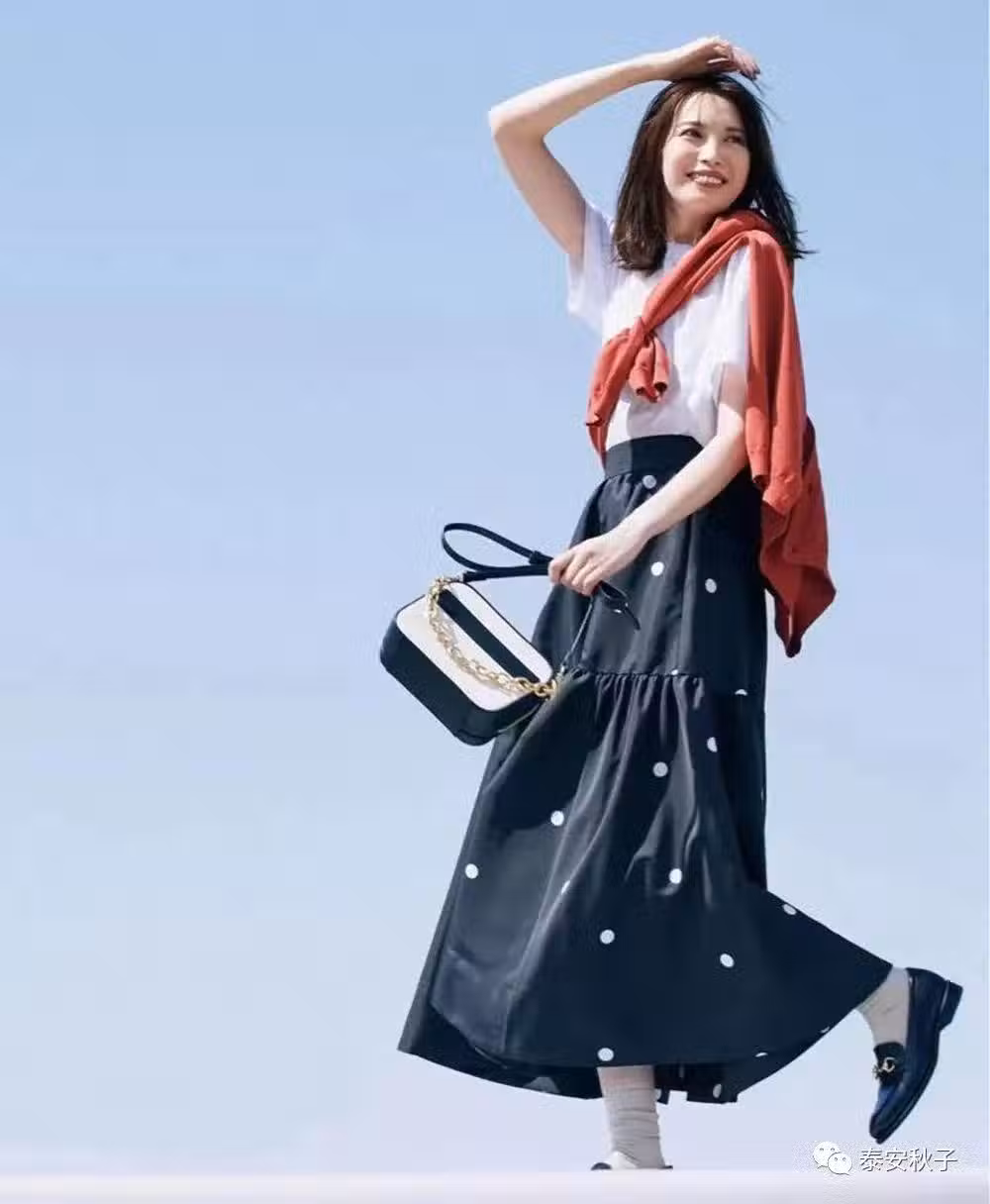 搭配一條黑底白點的半身裙,利用櫻桃紅色披在肩頭做點綴,休閒中又有些小女人的味道。