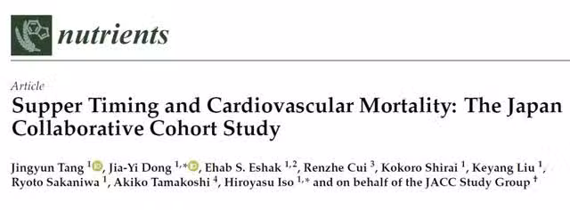 日本大阪大學研究團隊曾在權威期刊《營養素》上發表了一項研究,研究人對平均年齡40-79歲的7.1萬餘名受試者進行了調查。重點考察受試者的晚餐時間與中風、冠心病、總心血管疾病死亡風險之間的關係。