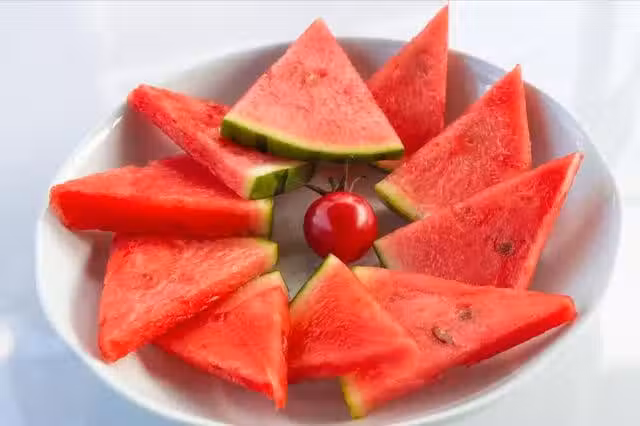 並不是看西瓜整體的顏色,而是要看西瓜上面,有沒有一小塊發黃的部分。如果有的話,就代表這個西瓜,成熟到了極點,也就是完全熟透了,不管是甜度還是水分,都相當好。因此買西瓜時,記得挑選有一小部分黃顏色的,更好吃。
