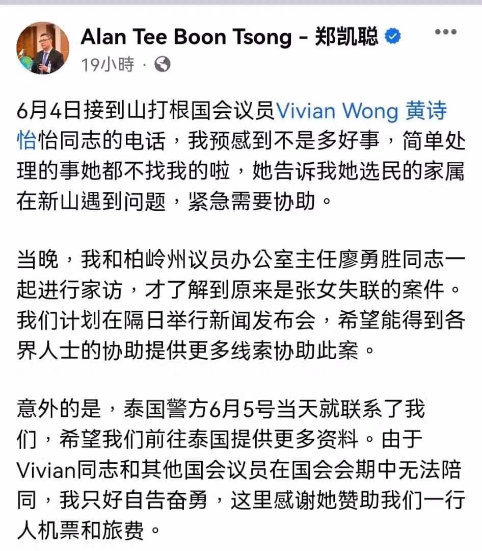 他日前在面子書透露,行動黨黨同志即山大根國會議員黃詩怡於6月4日向他求助,指她選民在新山的家屬遇到問題,急需協助,並在當晚安排家訪,才得知是張芯儀失蹤案件。