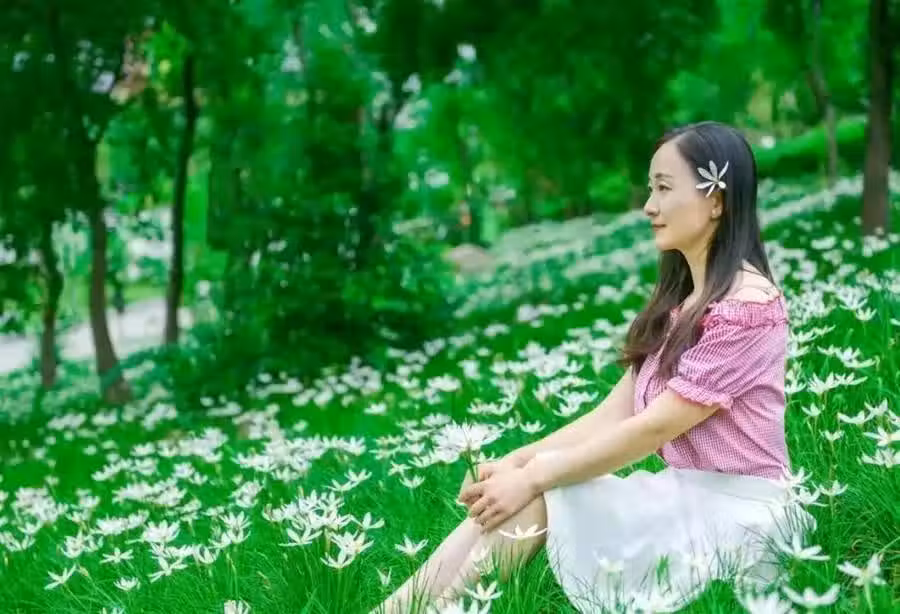 用手抱膝的動作,一般適用於坐在草地上,花海邊,田園邊,大海邊等等。這個動作也特別適合中年女性,看起來優雅安靜又自然。
