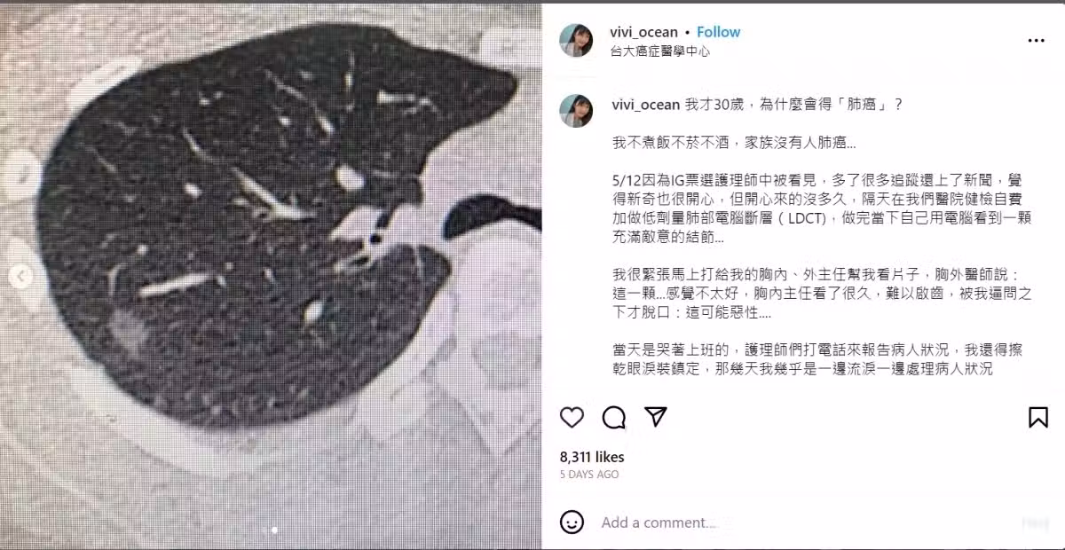 上月才被網民選為「全台最正護理師」之一的護理師雅薇驚傳罹患肺癌,她近日在IG上透露病況,表示自己不煙不酒且無家族病史,但月健檢自費加做低劑量肺部電腦斷層(LDCT)竟發現惡性結節,突如其來發現自己罹癌,讓她情緒崩潰,當天哭著上班,一邊流淚一邊工作。