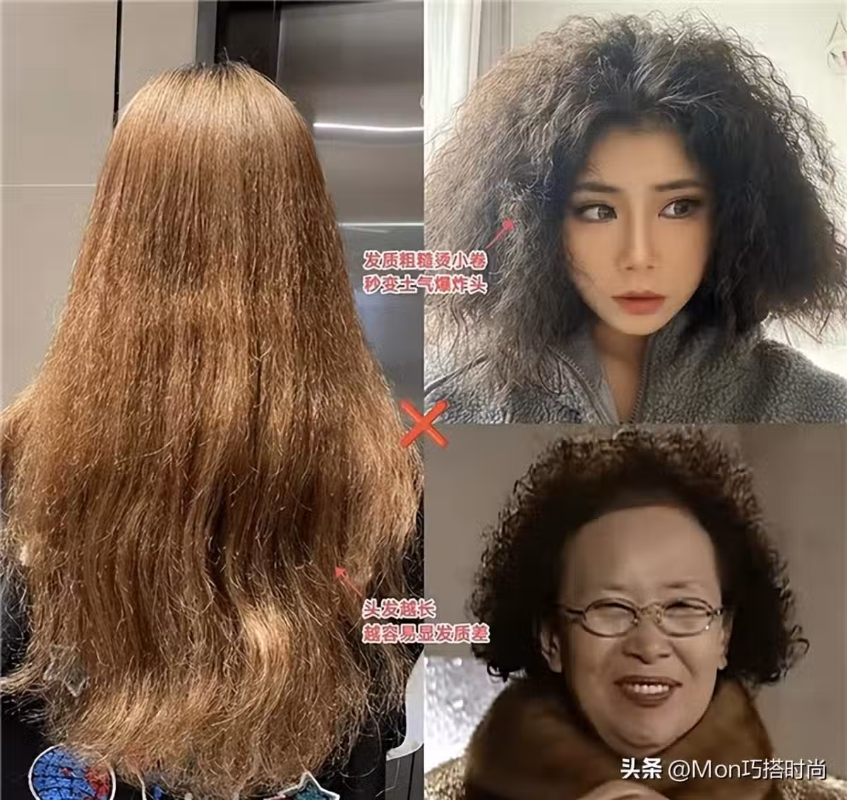 並且,這種小卷往往也很容易產生油膩感,比如說羊毛卷或者是泡麵卷的卷度非常的密集,這種髮型看起來很油膩,並不適合紮起來;到了夏天,這種披頭散髮的小捲髮就顯得很沉悶厚重,缺乏輕盈感,不僅沒有修飾臉型,反而會顯臉大!