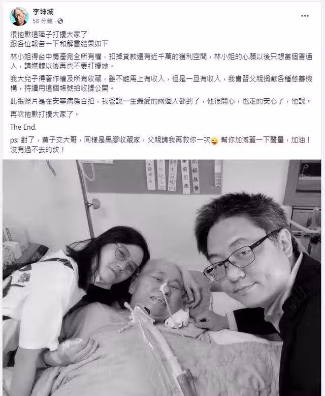 前陣子撕破臉鬧得沸沸揚揚,李卓軒20日PO出在爸爸臨終前和林靖恩一起拍的照片,宣告糾紛終於畫下句點:「此張照片是在安寧病房合拍,我爸說一生最愛的兩個人都到了,他很開心,也走得安心了,他說。」而他也為這段時間造成紛擾而道歉:「再次抱歉打擾大家了。」